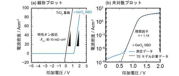 京都工芸繊維大学らの研究グループは、超ワイドバンドギャップ半導体の「ルチル型二酸化ゲルマニウム」を用いた「縦型ショットキーバリアダイオード(SBD)」の開発に初めて成功した。作製したSBDは、理想に近いダイオード特性と低オン抵抗であることを確認した。