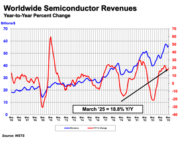 米国半導体工業会によると、2025年3月の世界半導体売上高は前年同月比18.8%増の559億米ドルで、3月の売上高として過去最高を更新したという。前年同月比では11カ月連続で17%以上の成長となる。