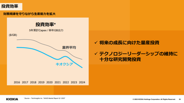 投資効率(単年ギガバイト出力の増加量に対する過去5年間の累積資本的支出[Capex])では「技術力によるコスト競争力(下記リンク参照)をもって、業界ナンバーワンの投資効率の高さを維持していると自負している」と説明。「これまでも生産に対する必要な投資をしてきたが、引き続き当社の財務規律を守りながら、今後の成長を支えるために必要な投資をしていく。当社の強みであるテクノロジーリーダーシップを維持していくため、研究開発に対する投資も十分に行っていく」とした。