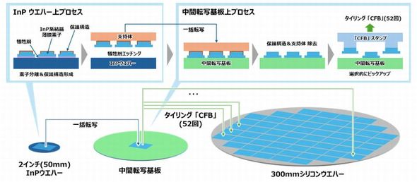 今回は、50mmのInPウエハーから300mmシリコンウエハーへのタイリング「CFB」技術を実証したが、100mm(4インチ)InPウエハーや、200mm(8インチ)シリコンウエハーなど、異なるウエハーサイズにも柔軟に適用できるという。
