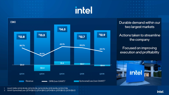 Intelは2025年第2四半期(4〜6月)の業績を発表した。売上高は128億5900万米ドル、粗利益率は29.7%で、純損失は29億1800万米ドルで、前年同期の16億1000万米ドルからさらに拡大した。業績不振が続くIntelは人員削減を進めているほか、ドイツとポーランドの新工場建設計画も中止した。