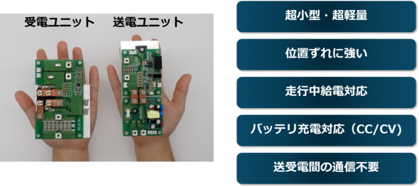 さらに、給電方式の違いによって送受電量の制御を簡略化しているので部品点数を削減でき、小型化も実現する。送電ユニットは148×61×59mm、受電ユニットは120×82×45mmと「出力電力600Wクラスでは業界最小レベル」(ブース説明員)だ。
