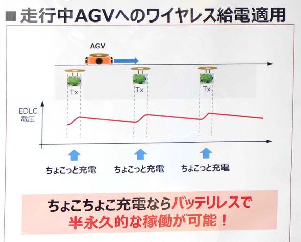 こうした特徴を生かして、ミラクシアはこのシステムを工場内の無人搬送車(AGV)/自動走行搬送ロボット(AMR)などに搭載し、給電スポットとすれ違うことで給電するという使い方を提案している。給電スポットで停止したりケースにはめ込んだりせずに走行しながら給電できるので、「給電中なので使用できない」ということがなく、効率的に運用できる。
