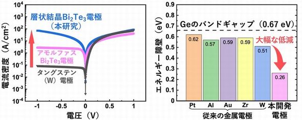 産業技術総合研究所(産総研)と東北大学は、電極材料にテルル化ビスマス(Bi2Te3)を用い、この薄膜とn型Geを反応させることで、電子が流れやすい界面を形成することに成功した。エネルギー障壁をこれまでの約半分に低減できるという。