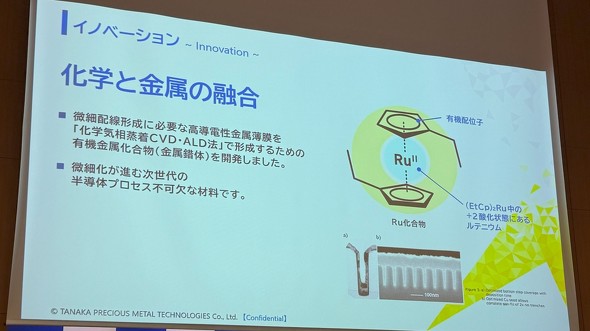 パワーデバイスの接合材料以外でも、化学気相成長法(CVD)/原子層堆積(ALD)用の貴金属プリカーサーを開発するなど、半導体製造前工程分野にも力を入れる。「微細配線の形成に必要な高導電性金属薄膜をCVD/ALD法で形成するための金属錯体として、ルテニウム化合物を開発した。半導体製造プロセスの微細化が進む中、金属材料の知識は欠かせないと考えている」(多田氏)