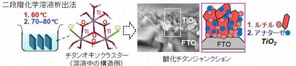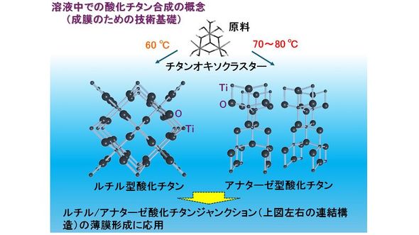 この試料を電子顕微鏡やX線回析パターンを使って解析したところ、60℃の低温領域では、ブルッカイト酸化チタンが、ルチル層と共存する形でわずかに析出されていることを確認した。また、ルチル/アナターゼ酸化チタン複合層の膜厚を100〜150nmに制御する技術も確立できたという。