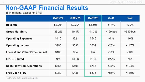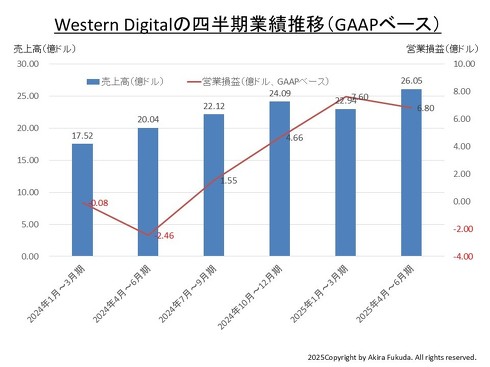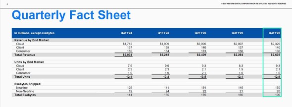 WDの会計期間はSeagateと同様に7月から始まり、6月を決算月とする。7月30日にWDが発表したのは2025年4月〜6月期の四半期業績であり、会計年度表記では「2025会計年度第4四半期(Q4FY25)」となる。