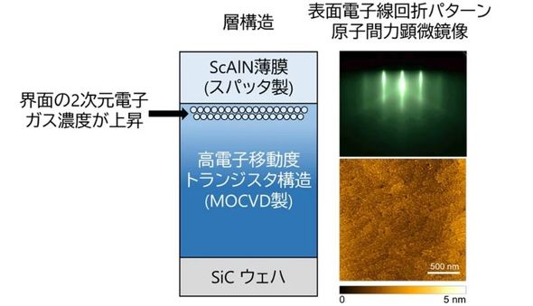 一方、電子移動度は全ての薄膜でScAlN堆積前より低下した。750℃で作製した薄膜の電子移動度は913cm2V-1s-1となった。低下の要因は主に、界面粗さや構造の不完全性による散乱のためだと分析している。750℃で作製した薄膜は、表面分析や構造解析によって、高い界面平たん性と結晶均質性を確認しており、構造品質が2DEG密度制御に直接影響していることを示すものだという。