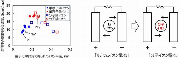二次電池として広く普及しているリチウムイオン電池は、電荷担体にリチウムイオン(Li+)が用いられている。ただ、イオン半径が小さいLi+は表面電荷密度が高く、電解液中で溶媒分子と強く相互作用するため移動速度が遅くなるという。