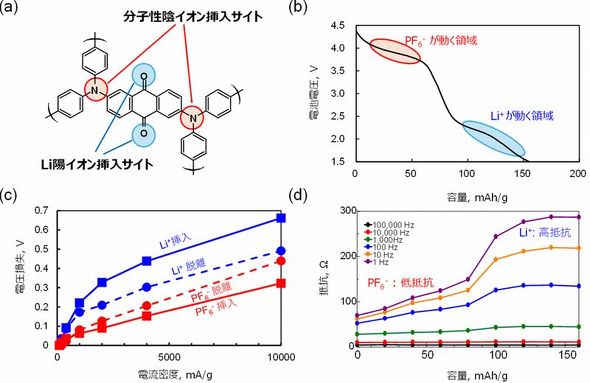 この高分子材料を用いた電極は、充放電を行う時に、高い電圧領域ではPF6-が、低い電圧領域ではLi+が、それぞれ出入りする。これらの領域でその挙動を測定し、2種類のイオンの動きを比べた。各電圧領域で電流値を変化させたところ、出入り時の電圧損失および移動に伴う抵抗は、いずれもPF6-が小さいことが分かった。これらの結果は、溶液中だけでなく固体の電極材料中でも同様に、PF6-が動きやすいことを示すものだという。