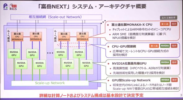 CPUには富士通が現在開発している汎用プロセッサ「FUJITSU-MONAKA」を発展させた「FUJITSU-MONAKA X」(仮称)を用いる。Arm SME(低精度行列演算器)に基づくNPUの搭載も検討する。