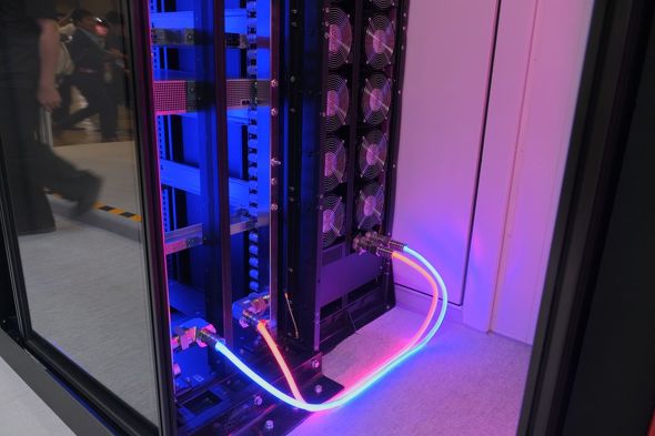 コンテナはデルタ電子製のサーバ用ラックや水冷システム、空冷システム、電源装置などで構成されていて、サイズや仕様はオーダーメイドで決められる。展示品はディスプレイ用ということで、全機能を長さ20フィート(約6m)のコンテナに集約しているが、実際は電源用コンテナ、AIサーバ用コンテナなどを複数連結して構築するという。