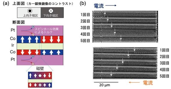 研究グループは今回、非磁性のイリジウム(Ir)層を強磁性のコバルト(Co)層および、ピンホール効果を示す白金(Pt)層で挟んだPt/Co/Ir/Co/Pt積層構造の人工反強磁性体薄膜を作製。これに電流を流し磁壁がどのように移動するかを検証した。