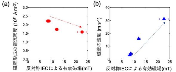 さらに、Co層の厚みを傾斜させて膜面内の構造を非対称としたところ、反対称の層間交換結合(IEC)によって、新たな有効磁場を作り出した。有効磁場が増えることで磁壁を生成するための電流密度が低くなり、磁壁速度は増加することが分かった。この現象はIECを活用することによって、小さな電流で磁壁を速く移動できることを示すものだという。