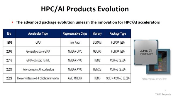 2020年には、ヘテロジニアス集積化によるAIアクセラレーター(NVIDIA A100)にも先進パッケージング技術が使われる。GPUダイ(A100)とメモリモジュール(HBM2E規格)を中間基板(インターポーザー)経由で接続し、同一のパッケージ(BGAタイプ)に封止した。