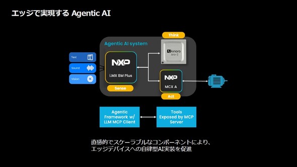 こうした見立ての下、NXPはエッジAI向け半導体を拡張してきた。2025年10月にはNPU(Neural Processing Unit)を手掛ける米Kinaraの買収が完了している。組み込み機器に適したアーキテクチャを持つKinaraのNPU「Ara」がポートフォリオに加わったことで、生成AIから一歩踏み込み、エージェントAIをエッジにも展開するソリューションにも力を入れる。そのため、eIQ Agentic AI Frameworkを含め、開発ツールの強化と刷新を図った。