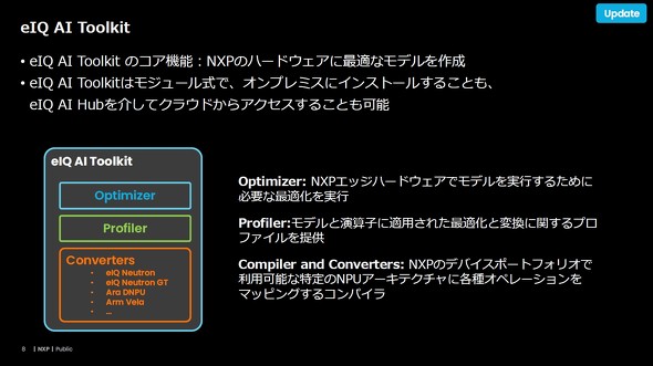 従来提供してきた「eIQ AI Toolkit」もアップデートした。eIQ AI Toolkitは、NXPのプロセッサでAIモデルを動かすためのコンパイラツールで、eIQ AI Hubの一つに含まれる。こちらもクラウドで使用できるようになる他、モデルの変換フォーマットを、従来のTensorFlow LiteやONNXだけでなくPyTorchもサポートできるようになった。さまざまなモデルを検証しやすくなる。