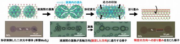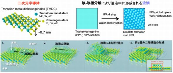液滴の生成には、液−液相分離現象を用いた。具体的には疎水性の有機分子「トリフェニルホスフィン(PPh3)」と低級アルコール「2-プロパノール」および、水を特定の比率で混合した溶液を用いる。この溶液を乾燥させる過程で、マイクロメートルレベルの液滴が突然形成されることが分かった。この大きさの液滴が折り畳み手法に有効なことも確認した。