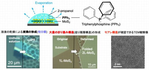 東京大学と北陸先端科学技術大学院大学、筑波大学らの研究グループは、液−液相分離によって形成される液滴を用いることで、二重構造の遷移金属ダイカルコゲナイト(TMDC)を作製するとともに、モアレ構造の形成を確認した。
