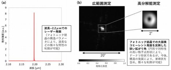 そして今回、光源構造を最適化するなどして2μm帯レーザーを試作。レーザー発振特性などを測定し、2μm帯において高い指向性や狭帯域といった特長が得られることを確認した。ビームパターンはフォトニック結晶設計によって、単峰状を含むさまざまなビーム制御が可能だ。フォトニック結晶構造を最適化していけば、用途別に最適な性能を実現できるという。