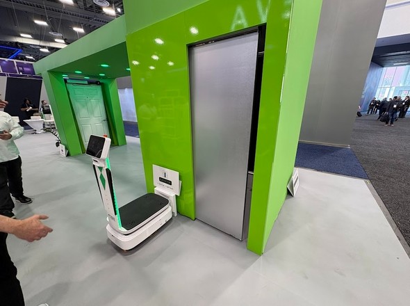 会場を歩いていると、至るところで見かけたのが自律走行する搬送ロボットだ。米TechForce Roboticsをはじめとする各社が展示していたこれらのロボットは、自律走行技術、ドア・エレベーター連携、AI×IoT×建物システムという3つの要素技術を組み合わせている。