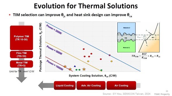 熱抵抗を大きく左右するのは、熱伝導材料(TIM:Thermal Interface Material)と冷却手法(放熱手法)である。TIMの熱抵抗(平方ミリ・℃/W)は材料によって大幅に異なる。ポリマーだとTIMの熱抵抗は10〜50とかなり大きい。薄膜化すると10以下、金属だと5以下と大幅に低くなる。ただしTIMの接続相手は表面が平坦ではなく、接続界面での熱抵抗が重要である。