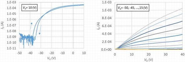 作製したr-GeO2 MOSFETの特性を評価した。この結果、ゲート電圧(VG)によりドレイン電流(ID)が5桁以上のオン/オフ比で変化。負のゲート電圧でドレイン電流がオフするデプレッション型トランジスタとしての動作を確認した。また、ID−VD特性のデータから、ドレイン電圧の増加に伴い線形から飽和特性へ移行するのが確認できた。