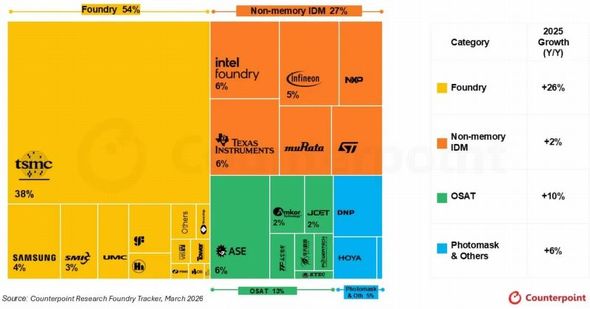 最新の調査結果によれば、専業ファンドリーの成長をけん引するのはTSMCやSMIC、Nexchipで、その中核を担っているのがTSMCだという。2025年第4四半期においてTSMCの成長率は前年同期比25%増だった。期初予想より成長率はやや鈍化したものの、通期売上高では前年比36%増となった。TSMC以外の専業ファウンドリーは、2025年に前年比8%成長した。