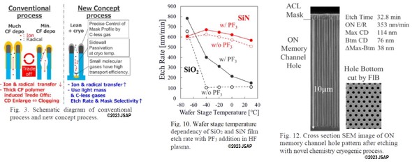 図3の中のFig.10をみると、SiNのエッチング速度は温度であまり変わらず、PF3を添加してもしなくても、あまり変化はない。一方、SiO2は、低温にするほどエッチング速度が上がる。また、PF3を添加すると、より高速なエッチングが可能になる。この選択性の温度依存性がクライオエッチの技術的根拠であり、−80〜−100℃とさらに低温化できれば、一層の高速化が見込まれるとされる。