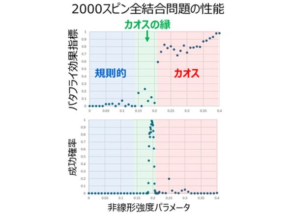 第3世代SBアルゴリズムは、位置変数に依存した分岐パラメーターの制御を個別に行う。この時、非線形制御の強さを調整する非線形強度パラメーターを変えていくと、非線形強度パラメーターが小さいときには「規則的な振る舞い」となり、大きいときは「不規則な振る舞い(カオス)」を示すことが分かった。これらの境界に当たる「カオスの縁」において、大域最適解に到達する成功確率がほぼ100%まで向上することが判明した。