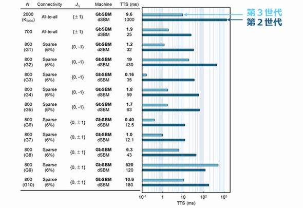 これらの現象は当初、2000スピン・全結合のイジング問題で確認されたが、、複数の異なる変数の問題においても、同様の現象が起こることが分かった。しかも、FPGAを超並列実装すれば、最適解または既知最良解を得るまでの時間が、第2世代SMBに比べ約100倍も速くなるという。