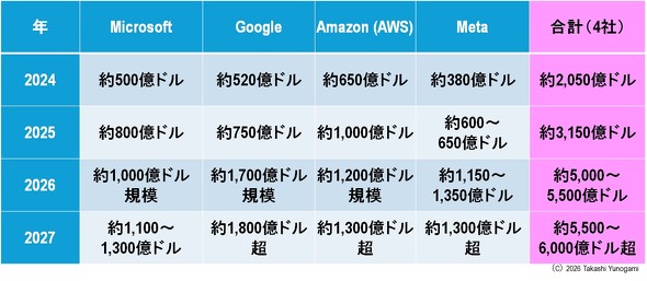 2025年から2027年にかけて、主要ハイパースケーラーは、以下の規模でAIインフラ投資を計画していた(図4)。