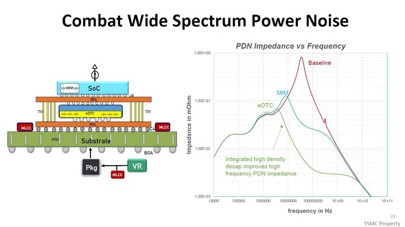 CoWoS-Lタイプの先進パッケージにおける電源インピーダンスの低減。左はパッケージの構造図。右は電源供給網(PDN)のインピーダンス(縦軸)と周波数(横軸)の関係。ベースライン(赤色)は通常の特性。MIM(水色)とeDTC(黄緑色)はキャパシターの挿入によるインピーダンス低減策を講じた特性[クリックで拡大] 出所:TSMC(IEDM 2025のショートコース(番号SC1-5)で公表された講演スライドから)高周波インピーダンスを下げるためには通常、キャパシターあるいはコンデンサーが使われる。CoWoS-Lタイプの先進パッケージでは、SoC(System on a Chip)チップの内部にMIM(Metal-Insulator-Metal)キャパシター群を作り込んだり、LSI(Local Silicon Interconnect)チップの内部にeDTC(embedded Deep Trench Capacitor)群を作り込んだりする。
