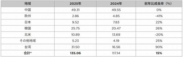 半導体製造装置市場を地域別にみると、投資はアジア市場に集中していることがより鮮明となった。2025年は中国、台湾、韓国での投資額合計が、世界市場の79%を占めた。2024年に比べ5ポイントも上昇したことになる。