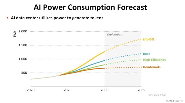 始めはAIデータセンターの総電力消費である。2025年における総電力消費エネルギーは、およそ500TWhとみられる。2030年には700TWh〜1250TWhに拡大すると予測する。そして2035年には750TWh〜1750TWhとさらに上昇する。最悪の場合、10年で3.5倍に増える。