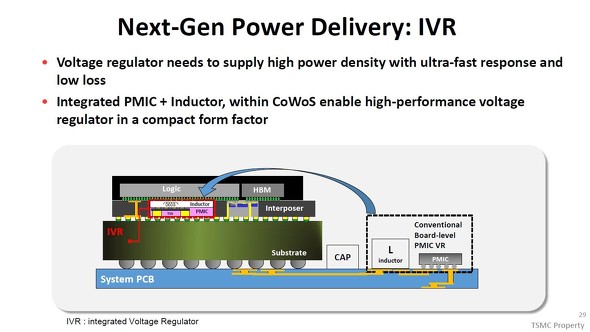 要求に応える手段の1つが、先進パッケージ内部に電源回路を設けることである。具体的には、中間基板(インターポーザ)の内部に電源管理IC(PMIC)とインダクター(L)を埋め込む。「統合化定電圧回路(IVR:Integrated Voltage Regulator)」とも呼ばれる。電源回路の体積が縮小するとともに負荷変動に対する反応速度が高まり、電源回路での損失が減る(電源の効率が上昇する)。