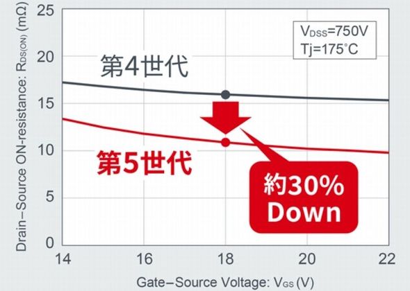 ロームが同社にとって第5世代「SiC MOSFET」を開発した。第4世代品に比べ高温動作時のオン抵抗を約30%低減した。電動車(xEV)用トラクションインバーターやAIサーバ用電源などの用途に向ける。