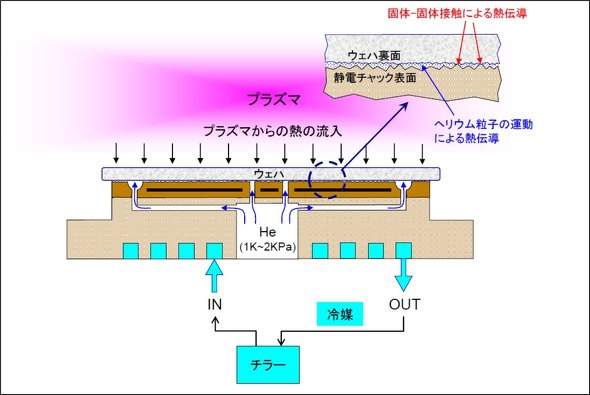 プラズマを使うドライエッチングでは、プラズマからの輻射熱・イオン・ラジカル・紫外線の入熱を受けながら、ウエハーを所望の温度に冷却し、かつウエハー面内の温度均一性を精密に制御しなければならない。US5624582A等の一次資料では、ウエハー裏面のHe冷却がエッチ速度、均一性、テーパー形状、寸法均一性を直接左右するとされている(Donnelly & Kornblit, "Plasma etching: Yesterday, today, and tomorrow," J. Vac. Sci. Technol. A 31, 050825, 2013も参照)。