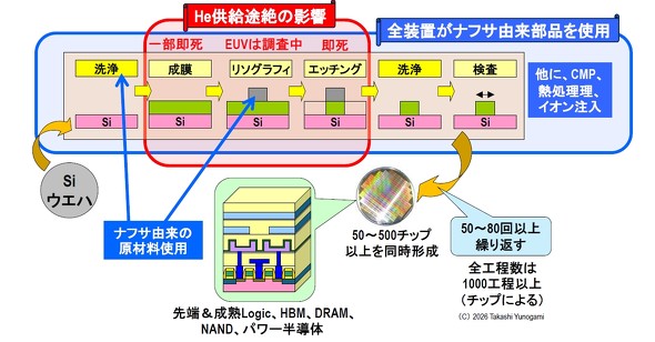 半導体業界にとって、中東情勢に伴うヘリウム(He)供給逼迫(ひっぱく)およびナフサの不足は、思っている以上に深刻な影響をもたらす。本稿では、これら2つの材料の供給が途絶/不足するという危機の本質を、主要装置に与える影響を考察しながら、詳細に解説する。