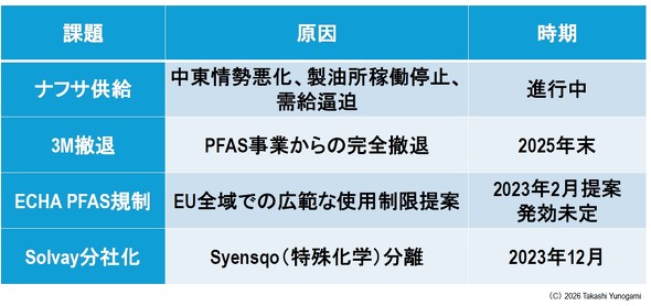 ナフサ/PFAS危機は図3に示すように、性質の異なる4つの圧力が同時期に重なって発生している点に特徴がある。