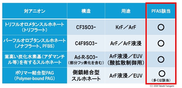 ここで前稿と接続する重要な事実を指摘しておく。3Mは2025年末までにPFAS事業から撤退した(3M Press Release, December 20, 2022)*)。3Mは、PAGの対アニオン部の原料となる特定パーフルオロアルキルスルホン酸誘導体の主要サプライヤーでもある。3M撤退は、FFKMやPFPEだけでなく、PAG原料の供給ベースをも削る。