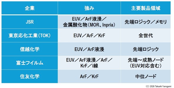 フォトレジスト世界市場は、日本企業の寡占構造にある。その主要プレイヤーは、以下の5社である(図4)。この5社の合計で世界市場の90%超を占めるとされる(参照:富士経済 2023年版;SEMI Materials Market Data Subscription)。そして、EUVレジストに限れば、この集中度はさらに高く、ほぼ100%に近い。なお、住友化学はEUV領域での実販売規模は外部から把握しにくいものの、EUV関連特許の出願件数では他社を上回る水準にあり、潜在的な技術ポテンシャルは無視できない。