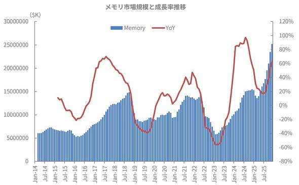 これまでのパターンで言えば、メモリ市場の成長率は2017年中ごろにピークを迎え、2019年中ごろにボトム、2021年後半にピークを迎えて2023年中ごろにボトムと、4年周期のサイクルを繰り返してきた。このパターンであれば、2025年がピークで2027年がボトム、という予想になるのだが、ややこしいことに伸び率だけを見ると、ピークはすでに2024年で到達しており、2025年は前半が下降、後半から上昇と、従来のパターンとは異なる動きをしている。上のグラフを見ても分かる通り、ハッキリしているのは、今回の出荷実績が前回、前々回のピークよりもはるかに高いこと、そして現時点でまだピークアウトが確認できていないこと、の2点である。