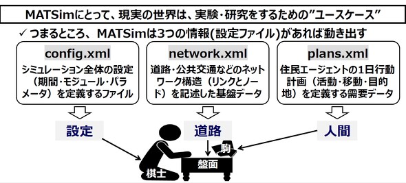 さらに、config.xml / network.xml / plans.xml の3つを「設定」「道路」「人間」、または「棋士」「盤面」「駒」という対応関係で捉えると分かりやすくなります。