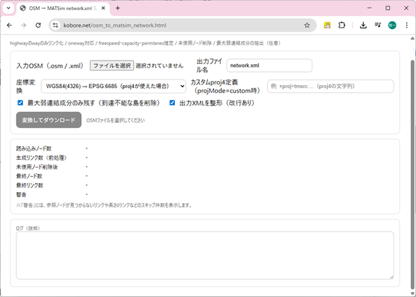 さて、ダウンロードしたOSMは、そのままでは使えないので、MATSimが読める形式(投影座標系)に変換しなければなりません。変換ツールは、その辺に落ちていると思うのですが、探すのが面倒くさかったのと、引数の指定が面倒くさかったので、サクっとプログラムを自作してしまいました。こちらのURLから ”osm_to_matsim_network.py”をダウンロードしてください。