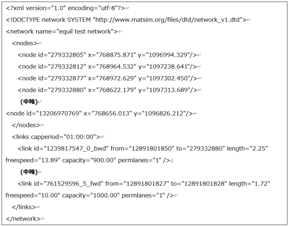 そのくせ、network.xmlでは、道路のキャパシティやら、レーン数やら、「道路の設定が恐ろしく細かい」という傾向が見られます。MATSimは『道路なんて、しょせんは“線”だろう』と考えていた私の考え方とは全く異なる思想で設計されていることが分かります(実は、これにはMATSimならではの理由があったのですが、後で説明しますね)。